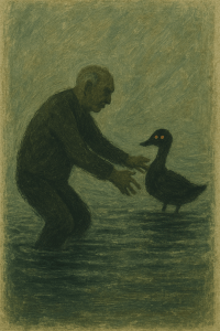 More weeks hurried past me. I spun out in growing confusion, unable to grasp anything solid to anchor me to reality. Ducks haunted the edges of my peripherals, waiting in shadows and peeking their bills around corners too quick for me to ever get a certain glimpse. Their honks and peeps were coded into sounds around me – a car horn, the ding of the microwave, my doorbell’s chime. They all had a definite honking quality that wasn’t there before. I had no choices left. In my slippers and dressing gown I stormed to the local shop to buy a loaf of 50/50. I put it through the self-service checkout. My tote bag confused the bagging area and a shop assistant had to help me. They looked worried and to my eye, slightly duck-ish. I hurried to the pond. I couldn’t stop. Something needed to give before my mind became unsaveable. I stood on the edge of the pond and stared. There he was. Nameless; my personal demon. My infernal patron. My nemesis. I stepped into the water. I could register the extreme cold but the sensation was numbed and distant. I waded deeper, slippers submerged. Ankles. Knees. Thighs. Waist. The other ducks scattered at my intrusion. I only hoped they’d forgive me. Eyes locked on Nameless I pushed determinedly through the reeds, pond scum and previously undisturbed sediment. What was my plan? I had no plan. But I needed absolution and confrontation was the only route I could see. Closer and closer I waded. Baffled dog walkers and their children stopped in their tracks and watched, their faces at a busy junction between horror and disgust. I ignored them, sights locked on Nameless’ foreboding form, which I’d now realised was many shades darker than his pond-mates, his plumage almost completely black. I’m panting now that I’m within reach, water above my belly button, dressing gown flowing behind me like the spectre I’d become. Still he doesn’t move, back to me, head lifted to the sun. I hesitate for a moment and as my heart pounds and I grab with both hands. He lifts easily from the water, unresisting and unwavered. I have him. I’m wheezing, mouth open as I turn him around to finally face me. I stare at him. He stares back at me. His eyes. Oh god, his eyes.