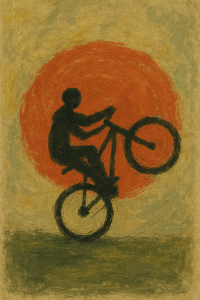 Empty as a reed, chakras perfectly aligned, Jack uttered quietly to no one, “spokes high.” And without thinking he tugged back on his handlebars and pedalled hard. The watching crowd held their breath and watched through activated third eyes.