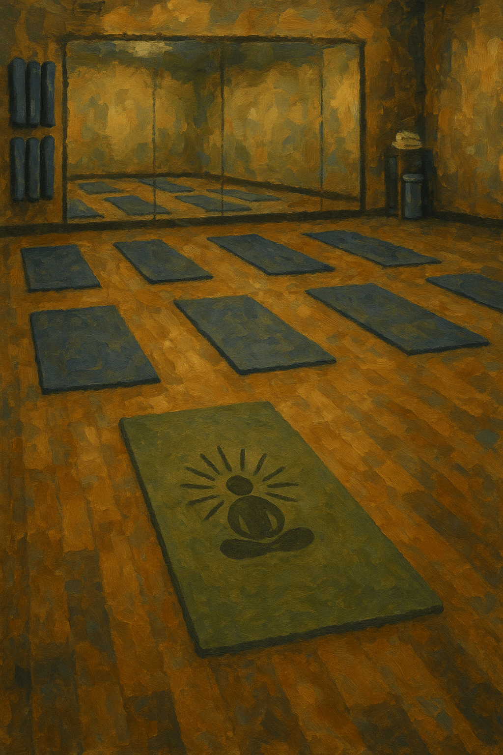 There’s the instructor. They’re so skinny and chill. Forearm tendons like a twisted jungle vine. I wonder if they know the ol’ beams-of-sunlight trick too. They probably feel like they’ve got perpetual sun beams shooting out of their head. They roll out their mat in one smooth push – looks like it’s got a decent weight to it and has ornate gold patterns around the edges. Classy. I bet it’s expensive and very grippy. I bet it smells like sage.