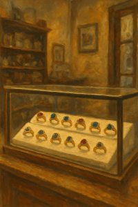 “Ah, then you’ve got a fine eye for quality. These are some of our most rare pieces.” Peter stood up a little taller than usual, moved behind the counter with a little more grace than usual and opened the glass cabinet where the rings were kept on display. He removed the display shelf and placed it on the counter. Peter invited the man in Tweed to choose one with a flourishing sweep of his hands over the rings. The man’s eyebrows lifted like rigged theatre scenery and he nodded, seemingly further impressed at the jewellery up close. His hand hovered in circles over the rings. He picked one up.